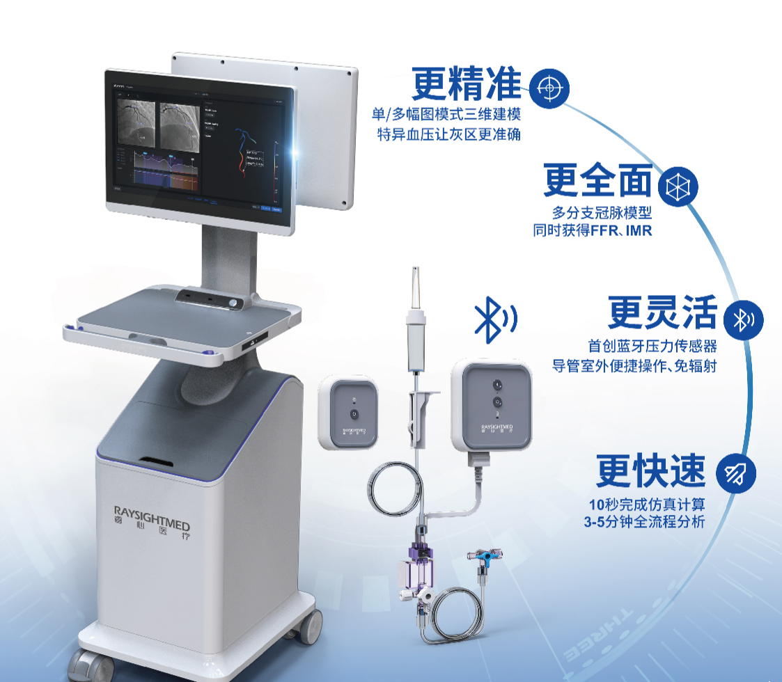 作为一站式冠脉宏观+微观功能学评估系统,睿心冠状动脉功能测量系统AngioQFA 100融合了睿心医疗自研的Ai、3D仿真与连通传感器芯片技术,可一站式获得冠脉FFR和IMR测量分析结果,并且具备斑块稳定性评估及手术规划的能力,在PCI全流程手术中提供精准指导。同时,睿心冠状动脉功能测量系统AngioQFA 100配置了一次性使用有创血压传感器,不仅计算精准度显著提升,而且相较同类产品覆盖更丰富病变类型。前瞻性临床研究表明:睿心冠状动脉功能测量系统AngioQFA 100的FFR、IMR测量结果与有创金标准结果一致性良好,准确性、敏感性、特异性均高达95%以上,领先行业,为临床提供了更可靠、精准、高效、全面的决策支持。